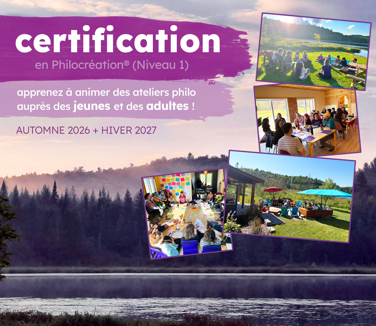 Découvrez notre nouvel espace en plein air situé à une heure au nord de Montréal ! Ce magnifique domaine de 96 acres comprend un lac, une forêt, un champ, des éco-cabanes et plus encore, afin de permettre aux jeunes et aux communautés de vivre des expériences philocréatives réellement immersives en pleine nature. Nous avons tellement hâte de lancer nos camps, ateliers et formations en plein air dès l'été 2023 !
